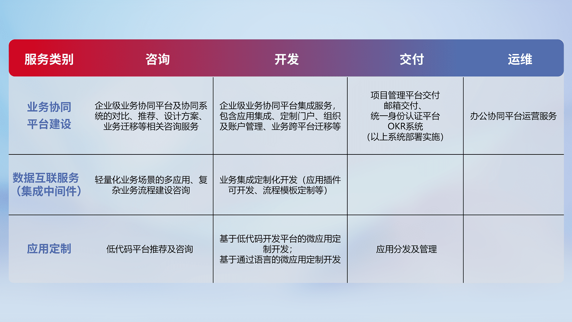 针对钉钉、、、、企微、、、、IDaas等平台级产品提供产品的规划、、、、方案、、交付、、定制化开发等服务,,实现如统一协同办公、、、智能客户服务、、、、混合会议管理、、、、智能数据查询、、等业务场景,,实现数字化转型。。。。