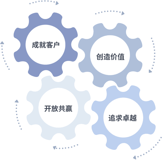 成就客户是一切决策的出发点,,,创造价值是衡量所有工作的标准,,,,追求卓越是我们做事做人的态度,,开放共赢是我们的格局也是最终的结果。。。价值观的齿轮环环相扣,,,推动着组织里的每个人不断向前。。