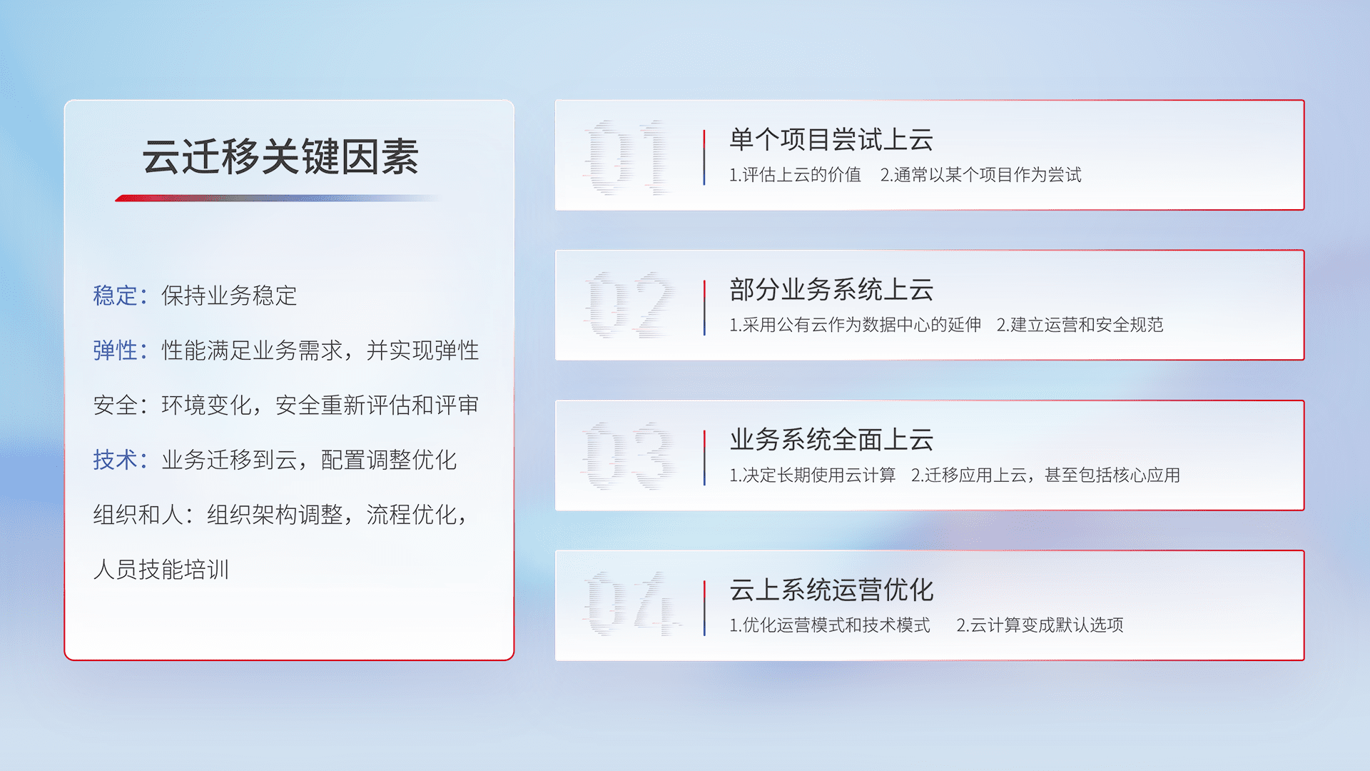 结合实际业务,,,,从规划设计、、、、云平台选型、、、云原生改造、、、、数据迁移、、、、集成交付,,,,迁移全过程为客户识别最佳上云路径,,做好风险识别管理,,设计网络架构、、、身份权限、、、安全审计合规、、操作审计、、日志审计、、监控告警策略、、、多站点容灾设计等,,,,对云上基础设施进行整体规划,,,,提升IT治理水平,,,,以满足弹性、、、、高可用、、、高性能的需求。。。
